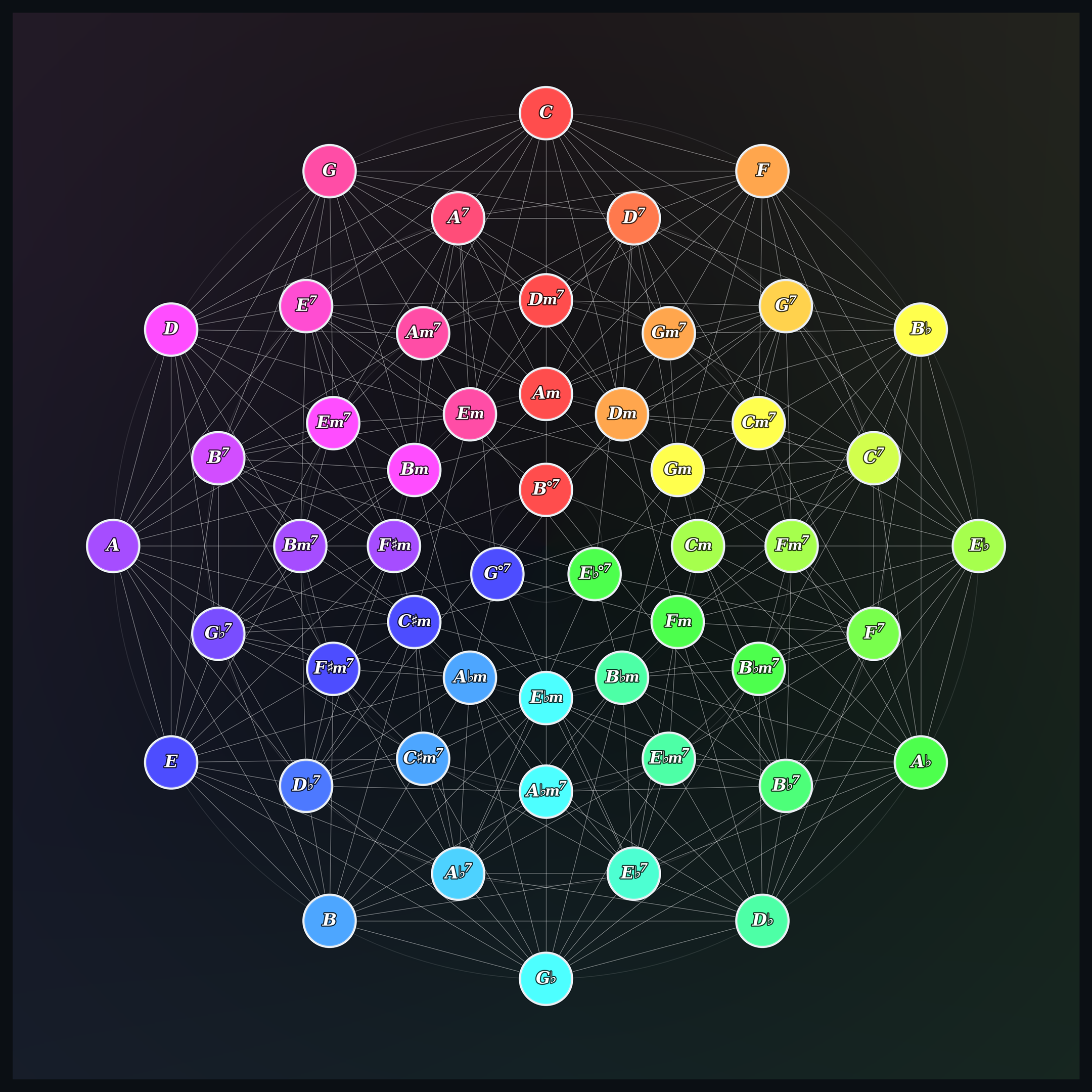 The Chord Flow Visualiser is an interactive extension of the cycle of fifths, showing how chords connect, resolve, and move through tonal space. Please explore the interactive version above; a static view of the full map is also provided below for convenience.